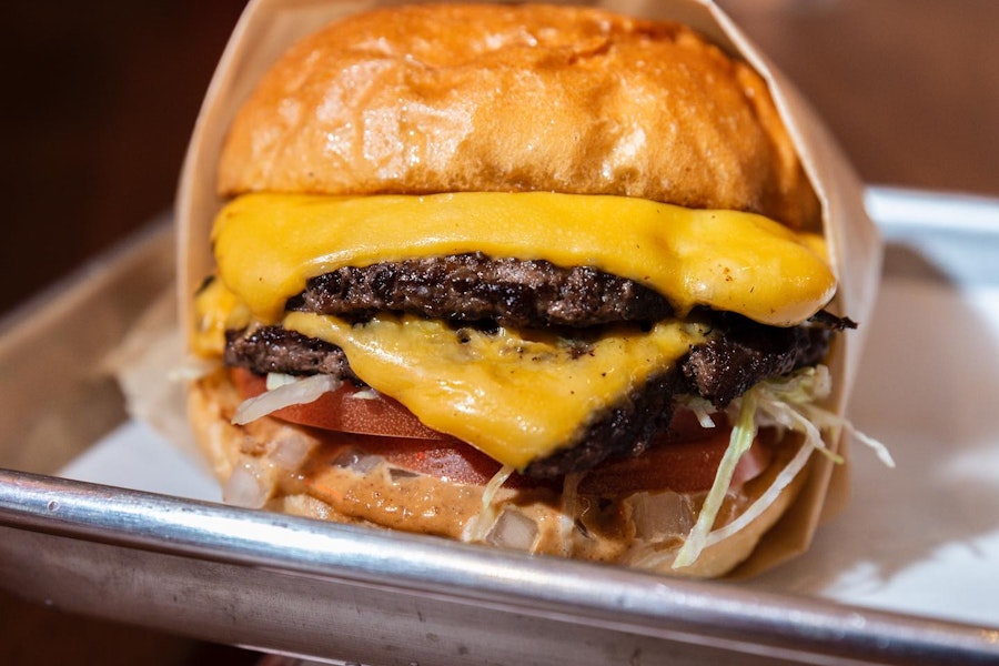 Smashed chuck patty. Topped with american cheese, holy sauce, lettuce, tomato, and onion on gluten-free bun