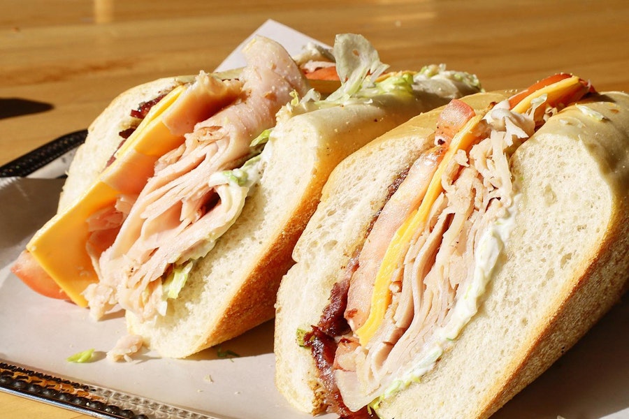 Succulent slices of slow-cooked beef between soft bread, topped with lettuce, tomato and mayo