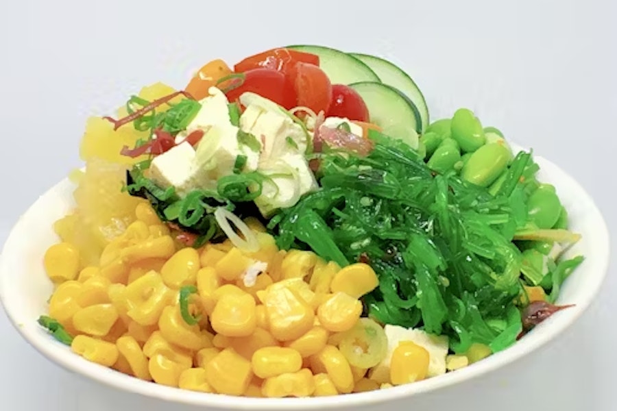 Steamed tofu, green onion, seaweed, salad mix, seaweed salad, edamame, corn, tomato, pineapple, cucumber