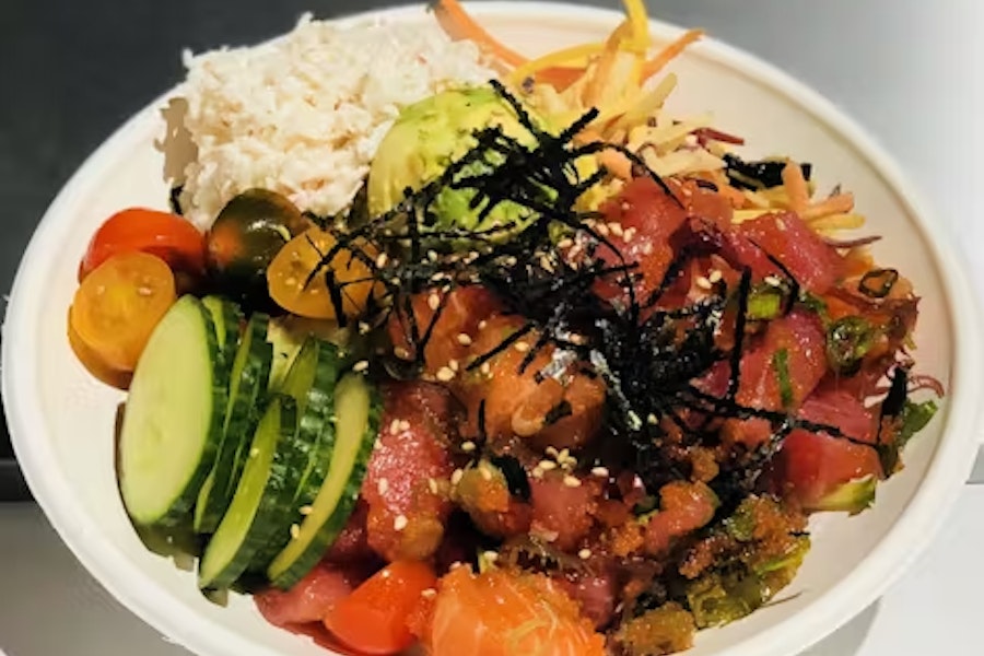 Cubed salmon, green onion, seaweed, fish egg, crab mix, carrot, cucumber, pineapple, edamame, and furikake