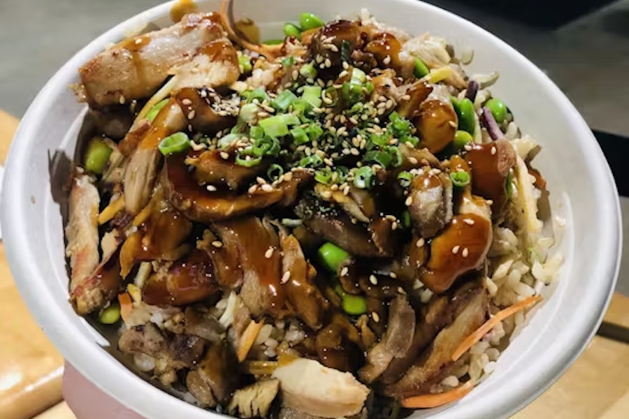 Grilled chicken, carrots, edamame, teriyaki sauce, sesame seeds & green onion over white rice