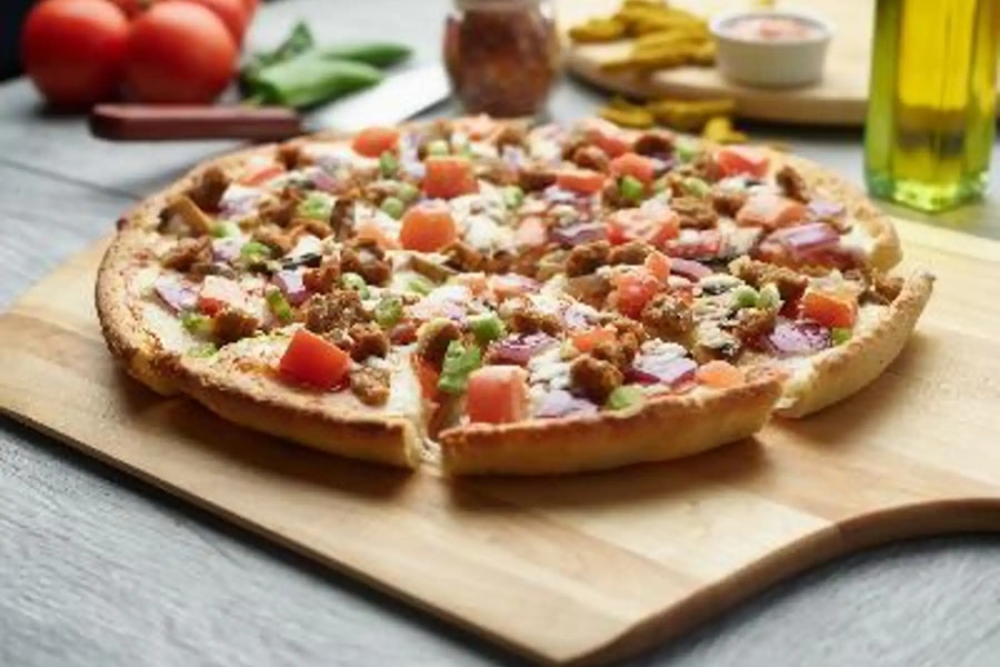 This pizza features our signature plant-based bbq sauce, complemented by our signature plant-based cheese and plant-based chicken. It is topped with fresh, crisp red onions, juicy tomatoes