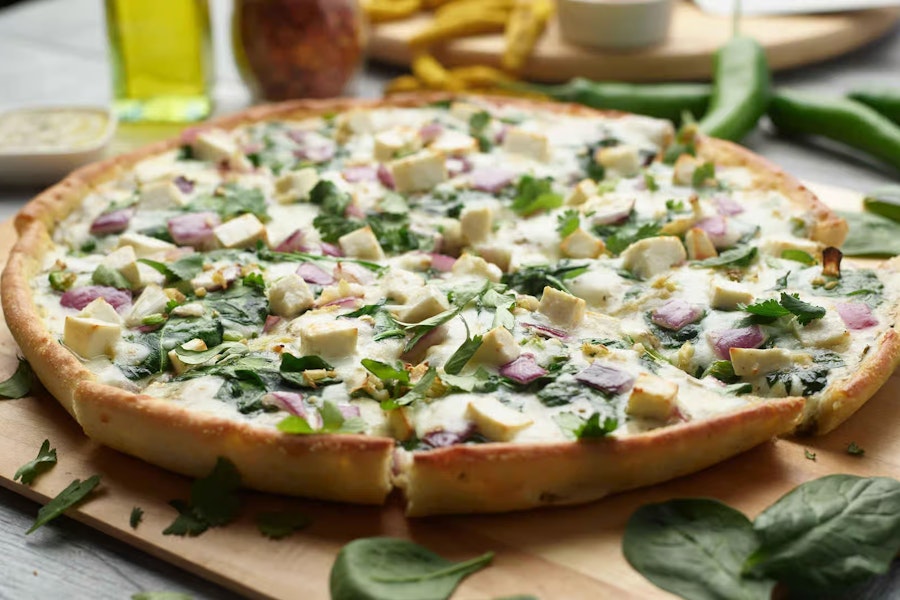 This pizza showcases our signature pesto sauce with paneer. It's layered with fresh diced mozzarella cheese, spinach, crisp red onions, and a medley of fresh diced garlic, ginger, and green chilies. Garnished with fresh cilantro for a vibrant and flavorful combination