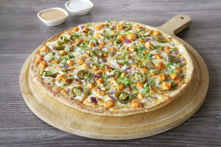 This pizza is crafted with our signature butter sauce with paneer. It's topped with fresh mozzarella cheese, crisp red onions, juicy tomatoes, and a blend of fresh diced garlic, ginger, and green chilies. Finished with a garnish of fresh cilantro
