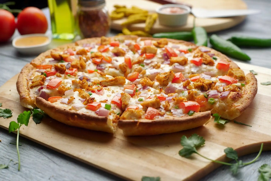 This pizza is prepared with our signature butter sauce, all natural chicken, fresh mozzarella cheese, crisp red onions, juicy tomatoes, fresh diced garlic, ginger, and green chilies, garnished with fresh cilantro