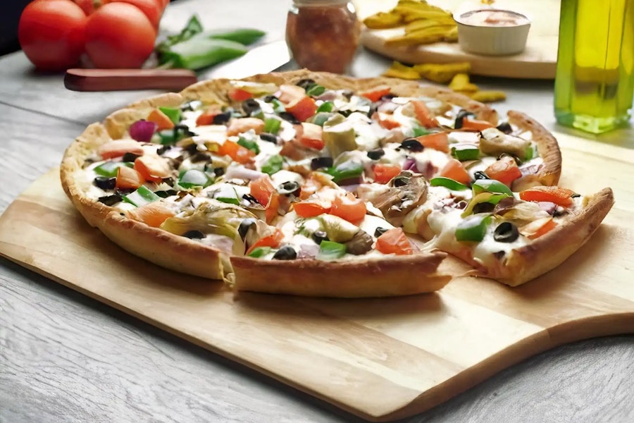 This pizza has our plant-based red sauce, plant-based cheese, mushrooms, red onions, tomatoes, black olives, green bell pepper & artichoke hearts