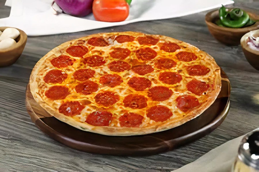 This pizza has our signature red sauce, fresh diced mozzarella cheese and pepperoni