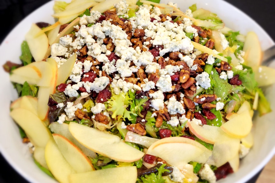 Mixed greens with gorgonzola, craisins, candied nuts, and honey balsamic dressing