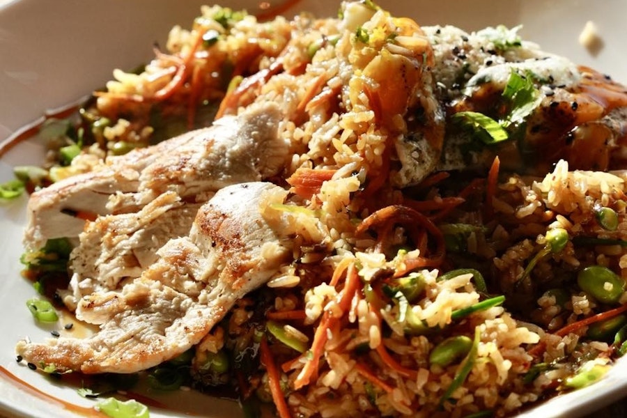 Arugula & mixed greens with napa cabbage slaw, almonds, togarashi, wontons, marinated mandarins, cilantro, green onions, and sesame grapefruit vinaigrette