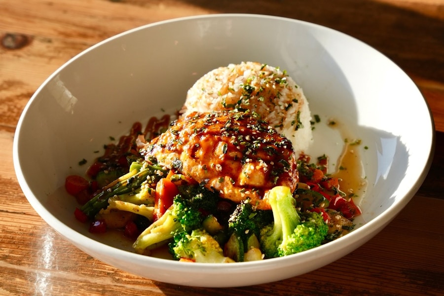 With teriyaki glaze (made with gluten-free soy sauce), sauteed mixed vegetables, steamed jasmine rice, and furikake