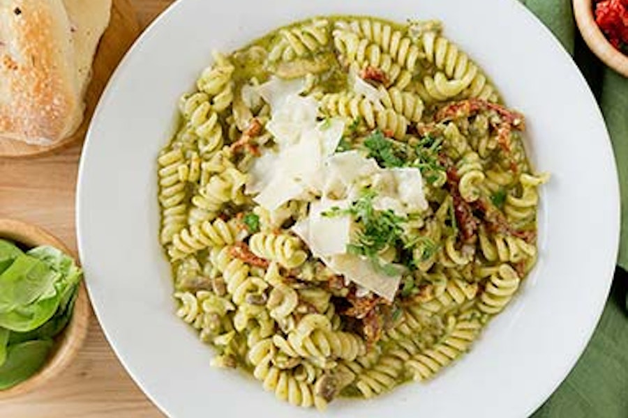 Fusilli pasta with sun-dried tomatoes, mushrooms, and pesto sauce