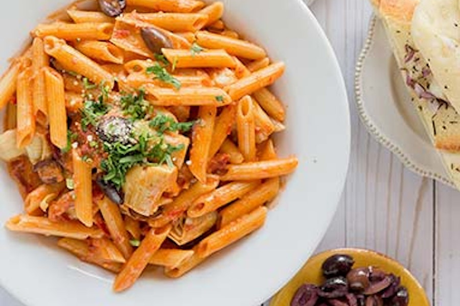 Penne pasta with artichokes, kalamata olives, sun-dried tomatoes, garlic, and pink sauce