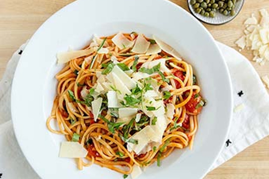 Fusilli pasta with roasted chicken breast, artichokes, capers, garlic, and lemon-butter sauce