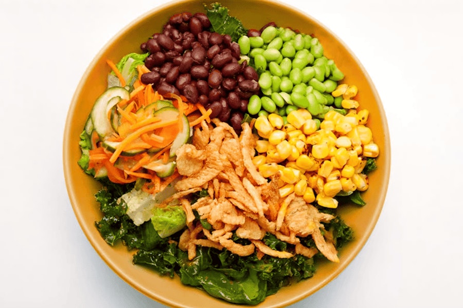 Crispy edamame falafel (contains gluten), cucumber namasu, roasted corn, marinated cherry tomatoes, black beans, seed blend with our greens blend and tossed with tzatziki dressing