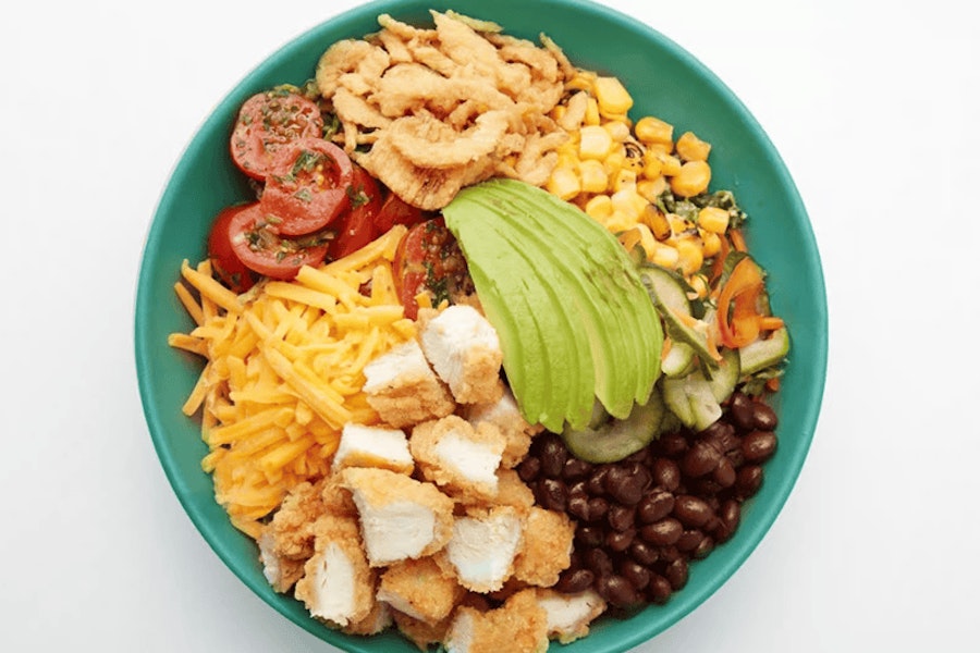 Fried chicken tenderloins, avocado, corn, marinated cherry tomatoes, black beans, cucumber namasu, cheddar cheese, grain blend with our greens blend and tossed with bbq ranch