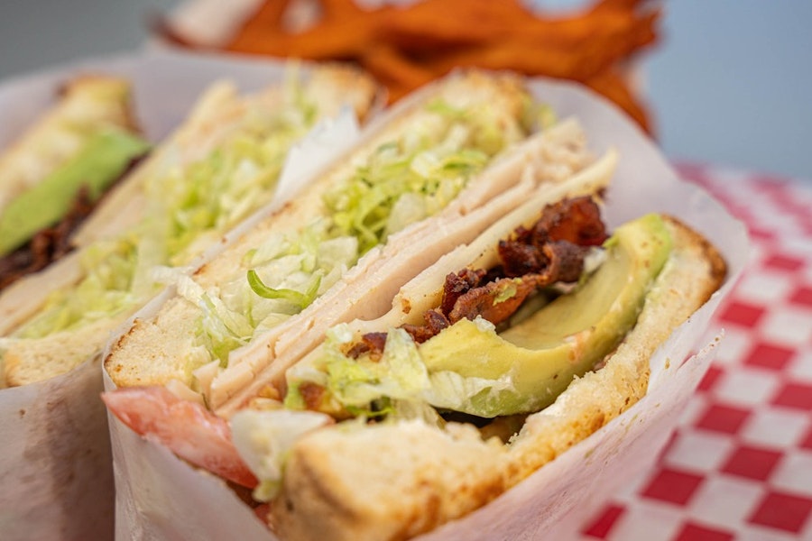 Turkey, swiss cheese, bacon, lettuce, tomato, avocado & mayo on white bread