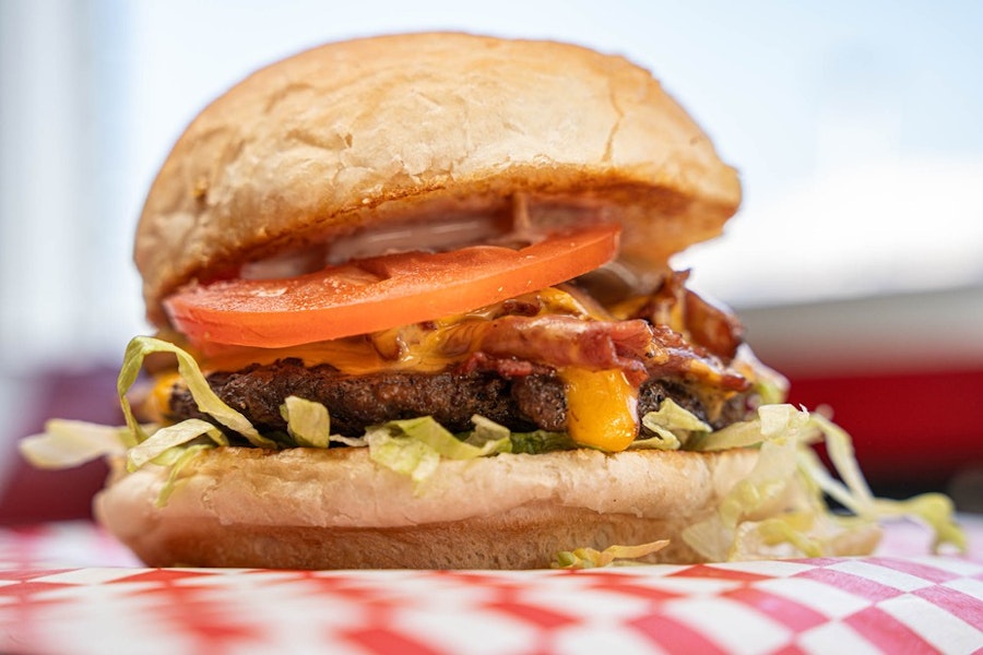 2/3 lb hamburger with bacon, cheese, tomato, lettuce, ketchup, mayo