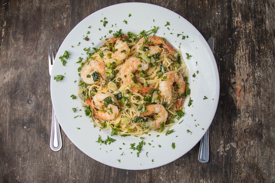 Capellini, shrimp, green onions, parsley, garlic & special scampi over spaghetti