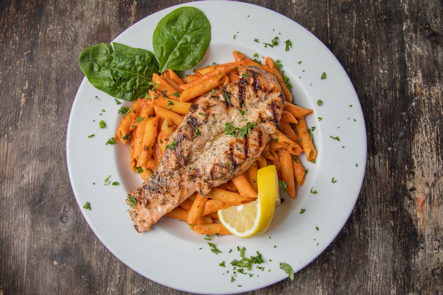 Penne, salmon, sun-dried tomatoes, basil in a creamy marinara sauce