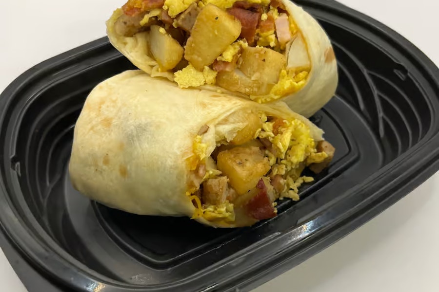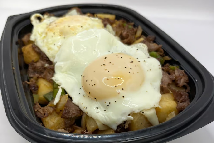 Thinly sliced steak, sautéed bell peppers, onions, and crispy breakfast potatoes topped with melted swiss cheese and scrambled eggs