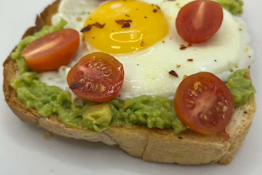 Smashed avocado on white toast, topped with a sunny-side up egg, cherry tomatoes, and a sprinkle of chili flakes