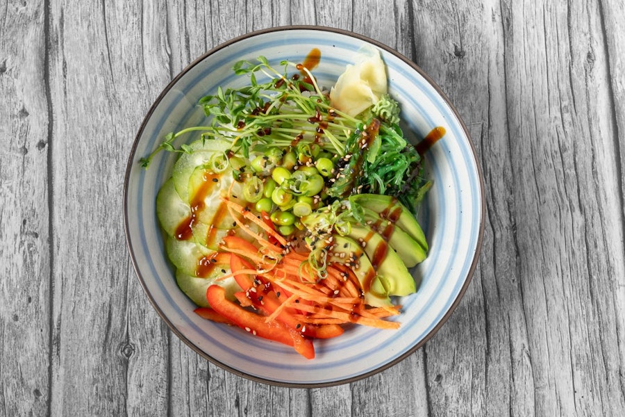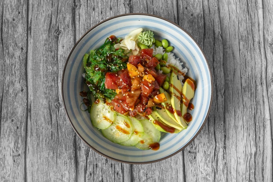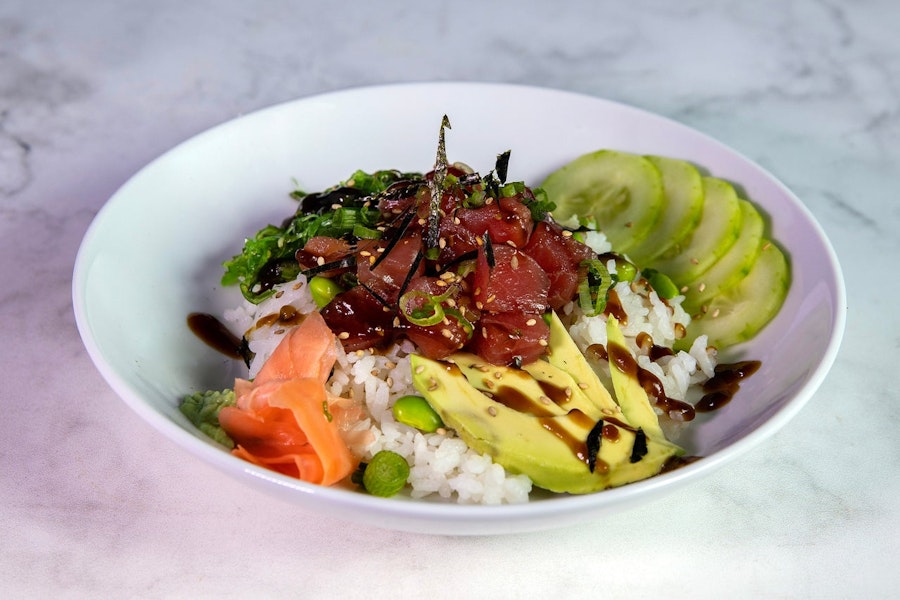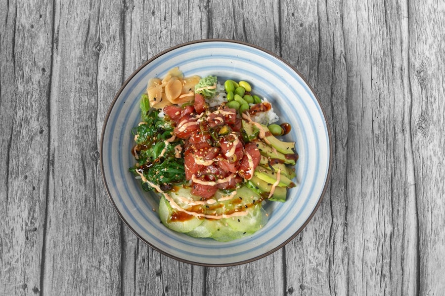 Sticky rice, poke, cucumber, edamame, avocado, scallions, sesame and nori strips & drizzled with sweet soy