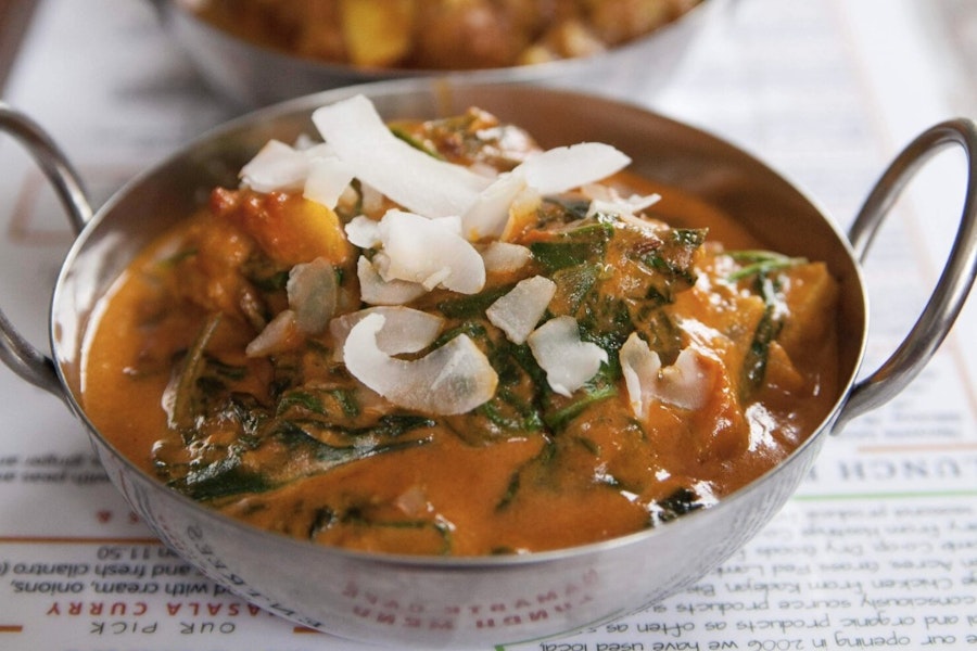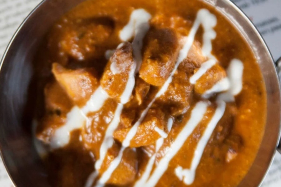 A rich curry prepared with cream, onions, tomatoes, ginger, garlic, and fresh cilantro