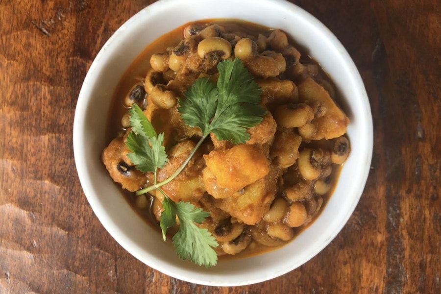 Black-eyed peas and potatoes spiced with turmeric, ginger, cumin, cayenne, paprika and a dash of lime juice