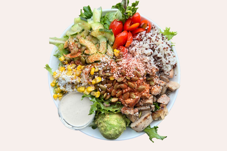 Grilled chicken thighs, grilled corn, avocado, tomatoes, cucumbers, pepitas, cotija, lime, tajin, avocado and our house-made caesar dressing