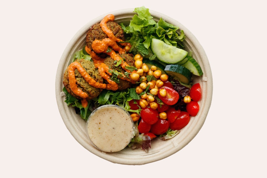 Baked falafel, cucumbers, tomatoes, red pepper & walnut dip, mint, crunchy chickpeas, & a house-made lemon za’atar vinaigrette