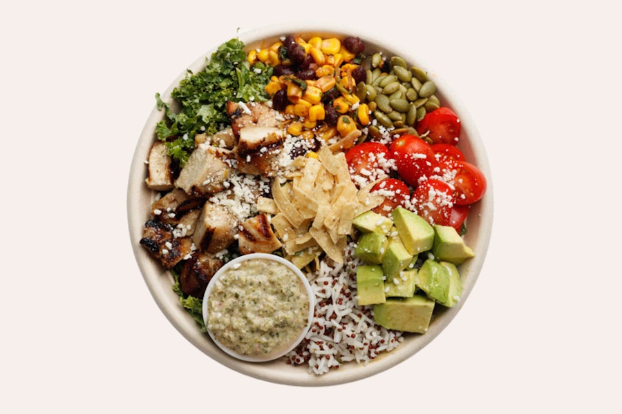 Grilled chicken thighs, corn & black bean salsa, tomatoes, toasted pumpkin seeds, tortilla strips, cotija cheese, avocado and a house-made tomatillo lime dressing
