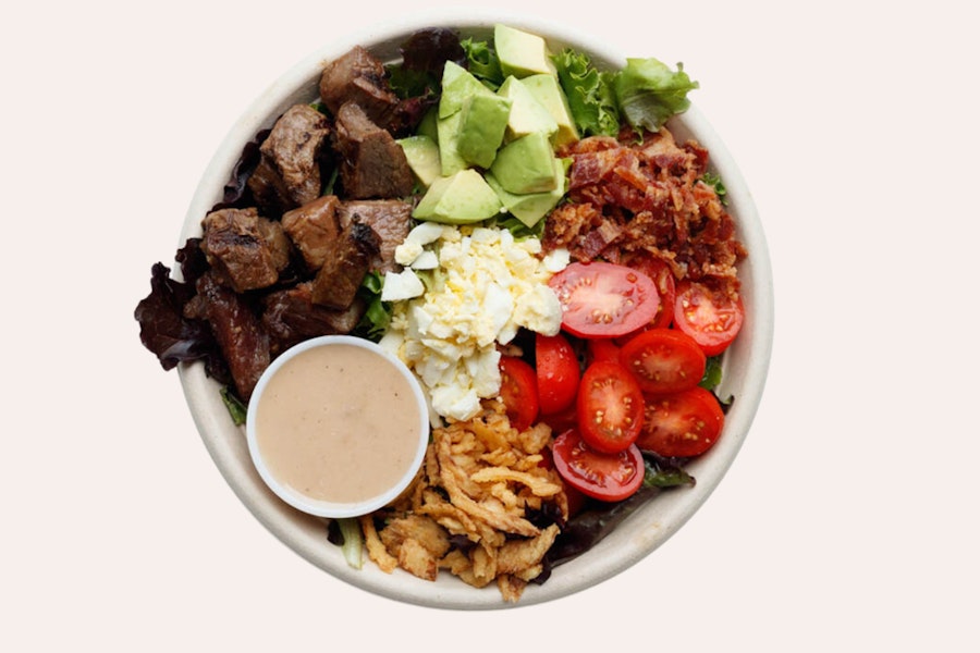 Grilled bear creek farm steak, bacon, hard-boiled egg, crispy onions, avocado, tomatoes, & a house vinaigrette