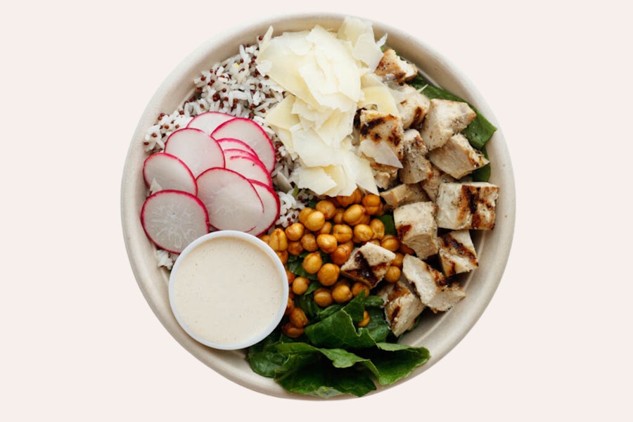 Grilled chicken thighs, sliced radish, crunchy chickpeas, tomatoes, parmesan cheese, & a house-made creamy caesar dressing