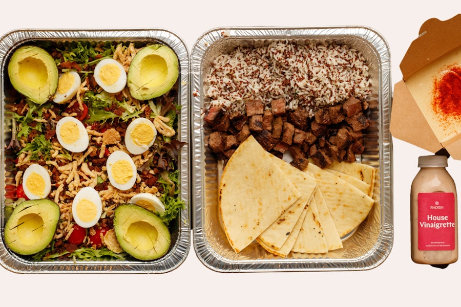 Rad cobb toppings, salad greens, grilled bear creek farm steak, our rice and quinoa grains mix, wraps, bottle of house vinaigrette dressing, and hummus