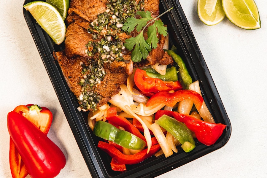 Sirloin steak and fajita veggies served with sour cream, jalapeño salsa, fresh cilantro, and lime, accompanied by corn tortillas