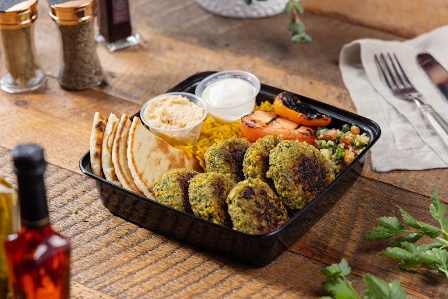 Baked falafel served with saffron rice, toum (garlic whip), tabbouleh, and half a piece of pita bread