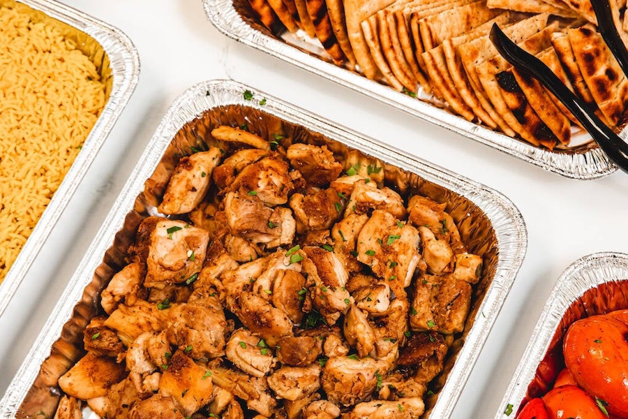 Served with saffron rice, grilled tomato & bell pepper, pita bread (not gluten-free), tzatziki sauce, tabbouleh (not gluten-free), and toum garlic sauce