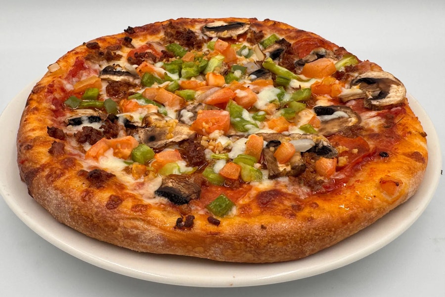 Mushrooms, pepperoni, onions, sausage, green pepper, tomatoes, and extra cheese