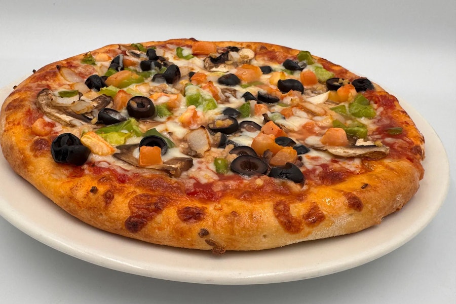 Mushrooms, onions, olives, green peppers, tomatoes, and garlic
