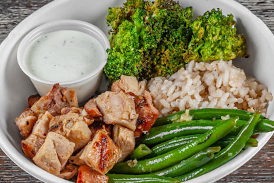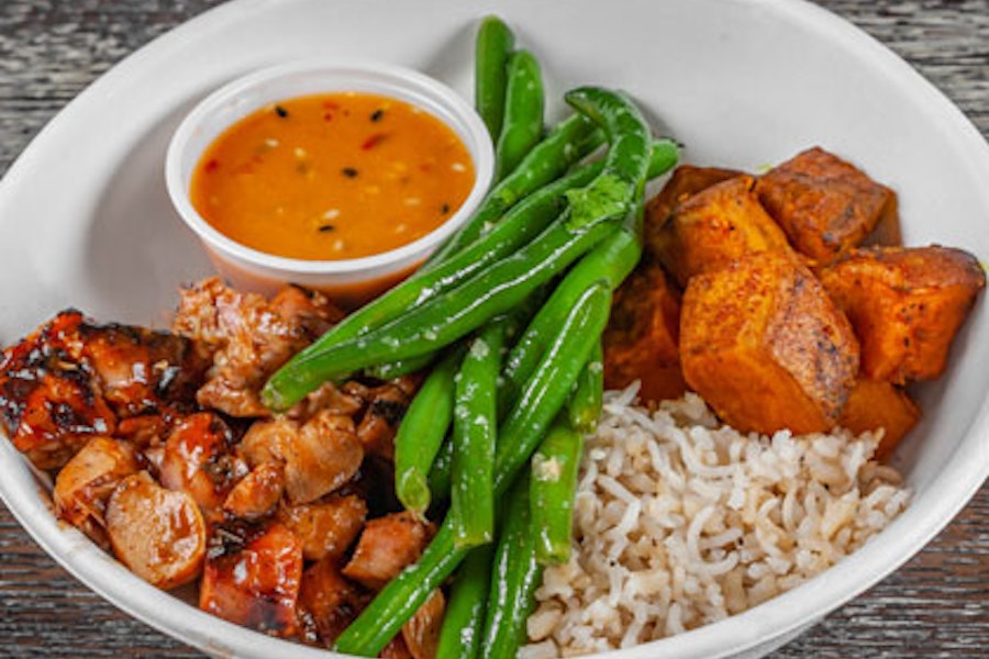 Basmati rice blend with roasted sweet potatoes, garlicky cilantro green beans, bbq chicken, and citrus ginger sauce
