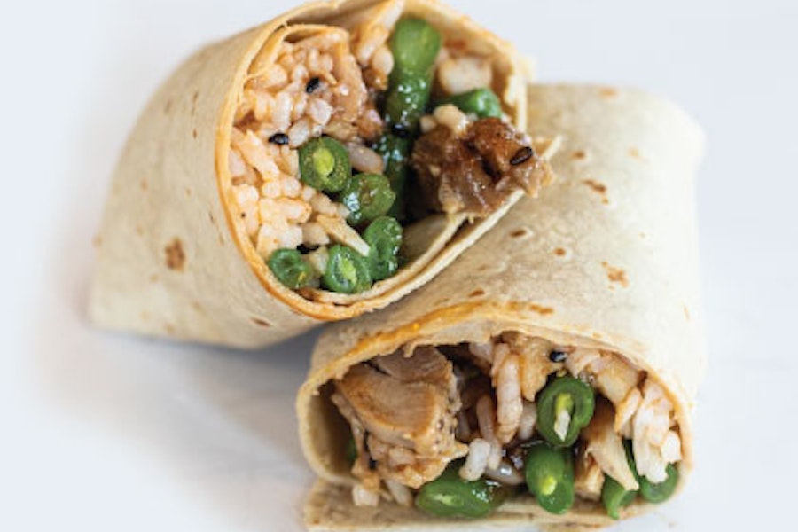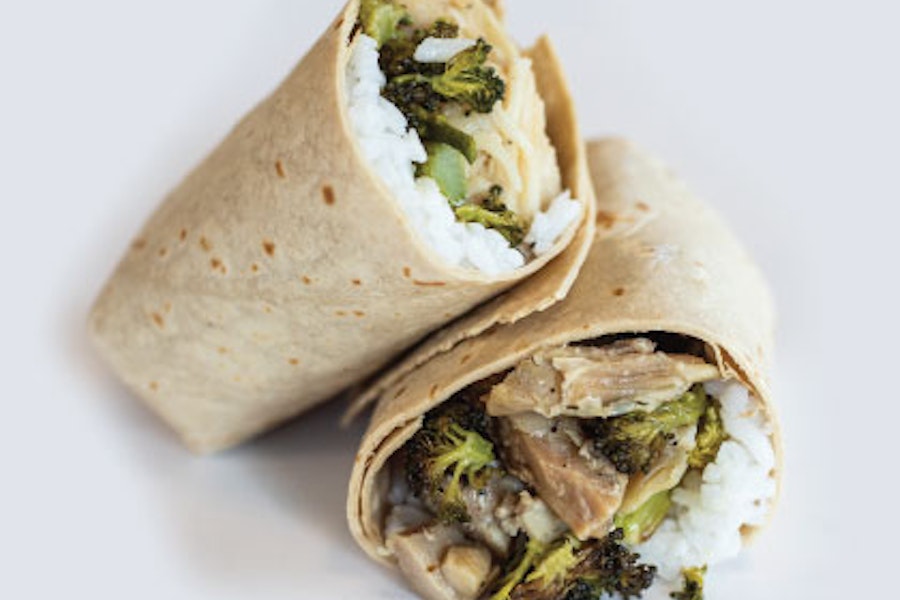 Coconut rice, sesame ginger broccoli & teriyaki chicken drizzle with creamy wasabi sauce and wrapped in a gluten-free flour tortilla