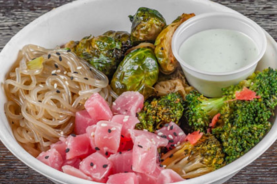 Sesame noodles with honey sriracha brussels sprouts, sesame ginger broccoli, spicy ahi tuna, and creamy wasabi sauce