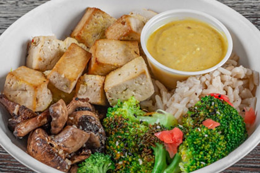 Coconut rice with sesame ginger broccoli, roasted mushrooms, sesame garlic tofu, and coconut sweet potato sauce