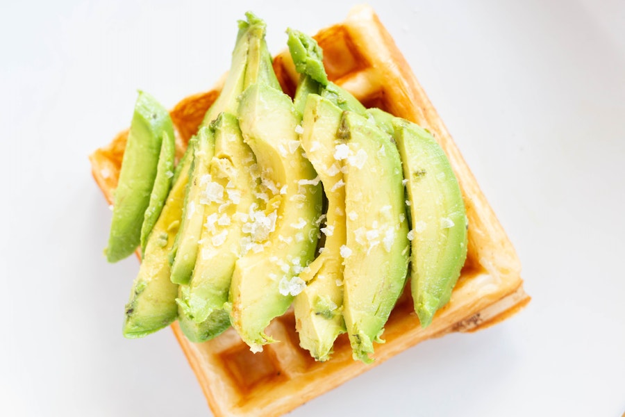 Two eggs, two slices of bacon, sliced avocado & a croissant waffle