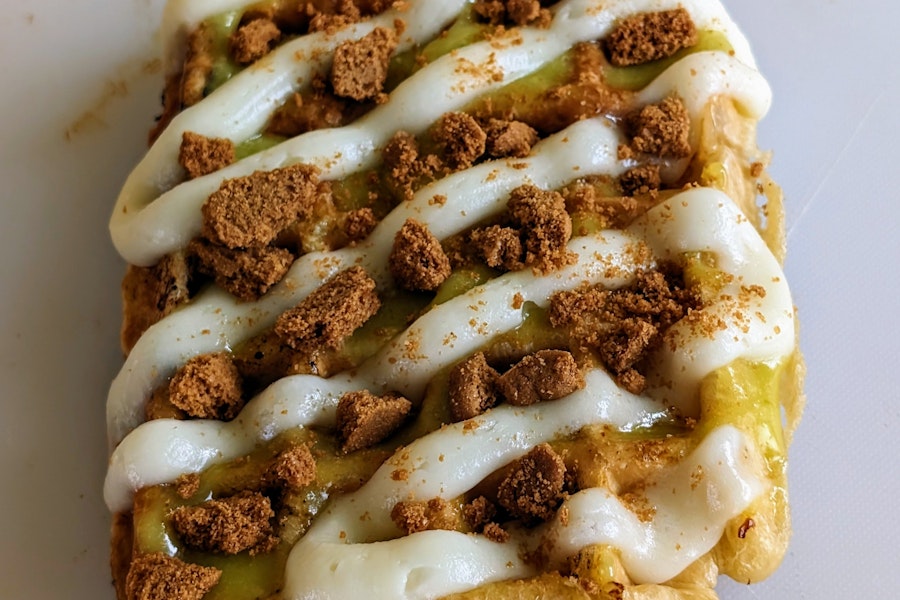 House-made lime curd, with cream cheese frosting and biscoff cookie crumble, on top of a liege waffle