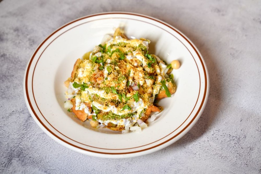 Crispy wafers mixed with chickpeas, potatoes, onions, mint, tamarind chutney and yogurt