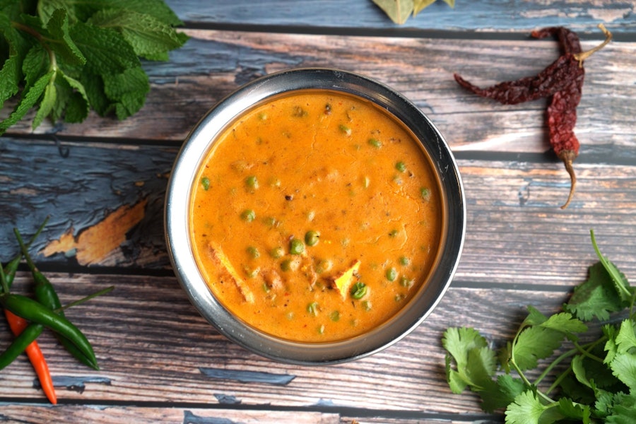 Paneer cubes and green peas cooked with onions, tomatoes, creamy cashew sauce, and spices