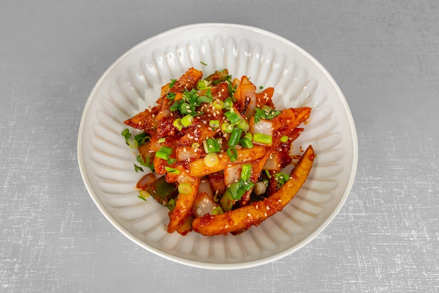 Fried potatoes coated in tangy indo-chinese chili sauce (contanins gluten)