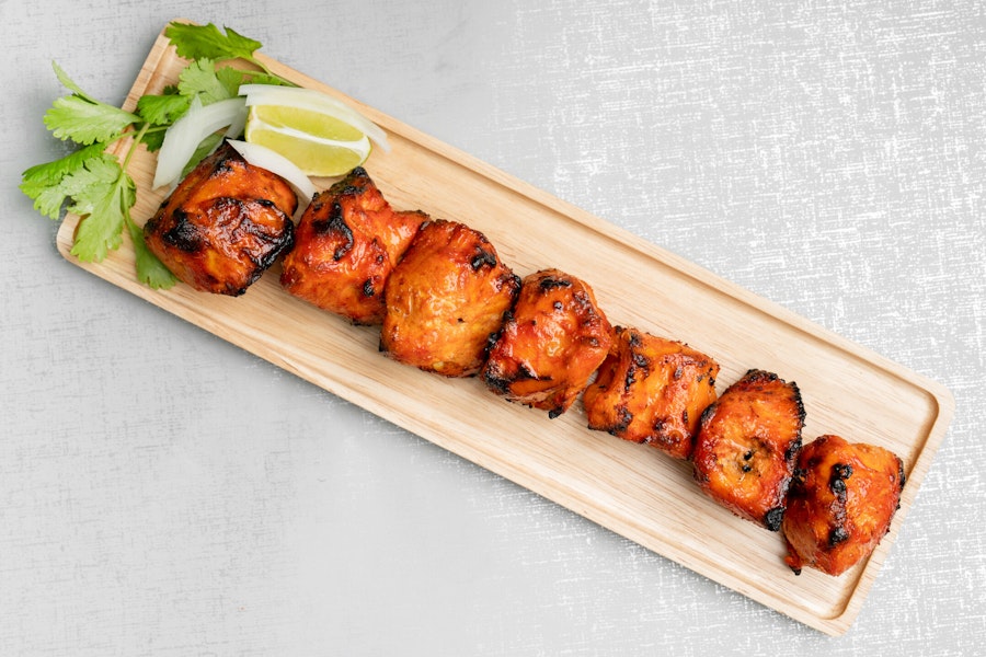 Grilled paneer (cottage cheese) cubes marinated in spiced yogurt