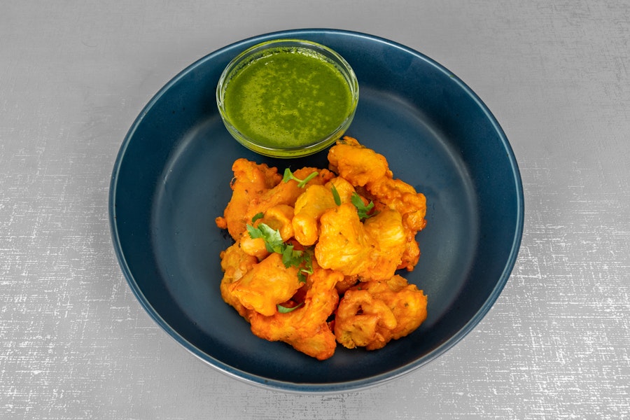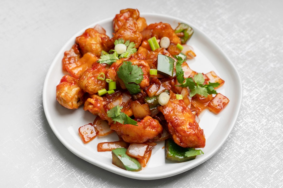 Cauliflower fritters in a tangy indo-chinese chili sauce (contains gluten)